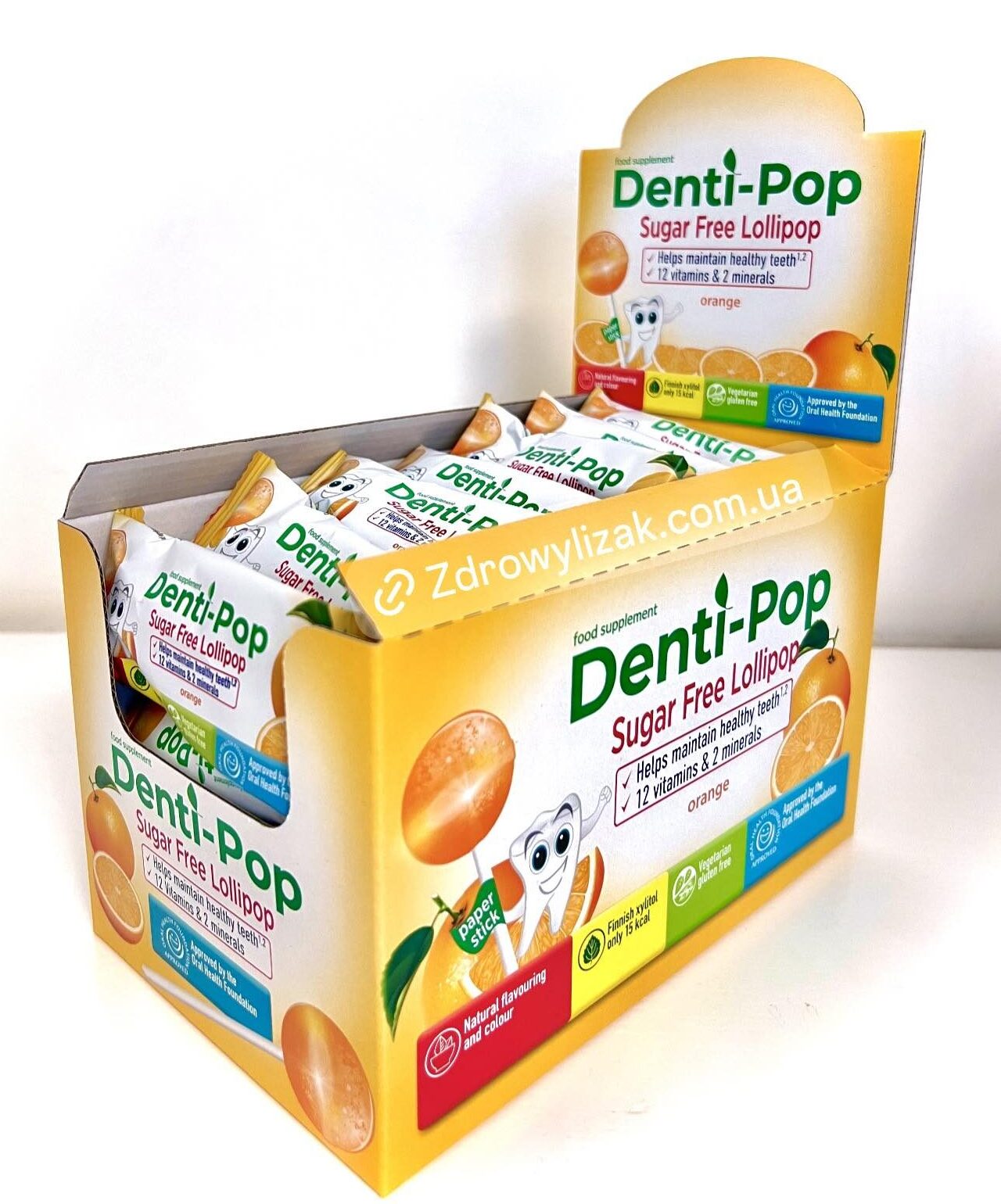 Натуральні льодяники Denti-Pop з смаком апельсину, з ксилітолом, без цукру, глютену, лактози, ГМО, та штучних барвників.